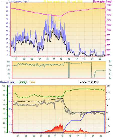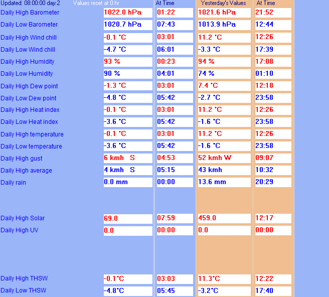 | Yesterdays rainfall | 13.6 mm | DewPoint | -1.7°C (Wet Bulb :-1.0°C ) |